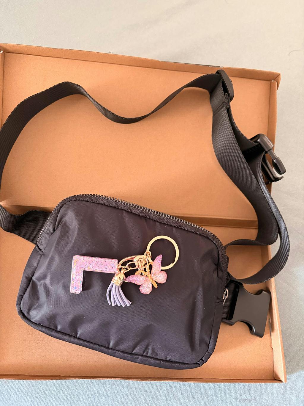 Adaugă un plus de stil ținutelor tale cu această borsetă damă neagră modernă, practică și versatilă, decorată cu charm elegant cu fluture roz glitter, ciucure mov și litera „L” SI "k".
